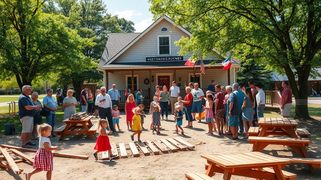 A small town joins together to raise funds and rebuild its beloved playground after a fire. Community efforts include donations, grants, and special events, bringing residents and local groups into action. Volunteers help with planning, fundraising, and even construction, making the process cost-effective and meaningful. This collective spirit aims to create a safe, modern space for future generations. Keep exploring to discover how your community can also get involved and make a difference.