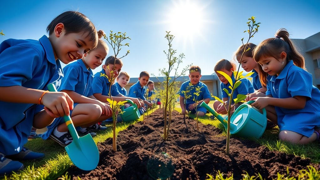 Students plant trees and actively transform their school grounds by creating greener, healthier environments. Through these initiatives, you learn leadership, teamwork, and environmental care while helping combat climate change and reduce urban heat. Your efforts beautify the campus and promote long-term sustainability. By tracking tree growth and caring for these plants, you gain valuable skills and insights that can inspire you to keep making a difference. Keep exploring to discover more ways your actions shape a better future.