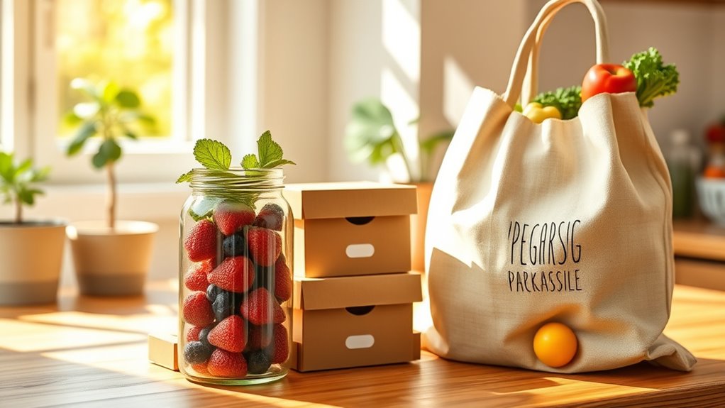 To reduce waste at home, choose eco-friendly packaging like biodegradable plastics and reusable containers such as glass jars or silicone bags. These options break down naturally or can be used repeatedly, helping lessen landfill waste and pollution. By opting for sustainable materials, you support a circular economy and a healthier environment. Stay tuned to discover more ways to make eco-conscious choices and contribute to a greener future in your daily life.