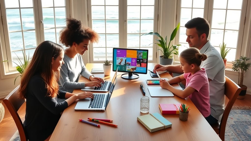 As a family digital nomad, you can combine remote work with flexible education options like worldschooling or online programs, allowing your children to learn while exploring new places. You’ll need to stay organized using digital tools and find suitable environments with reliable internet. Many destinations now offer supportive communities and legal visas that make this lifestyle easier. If you keep exploring, you’ll discover how to make remote schooling smooth and enriching for your family.