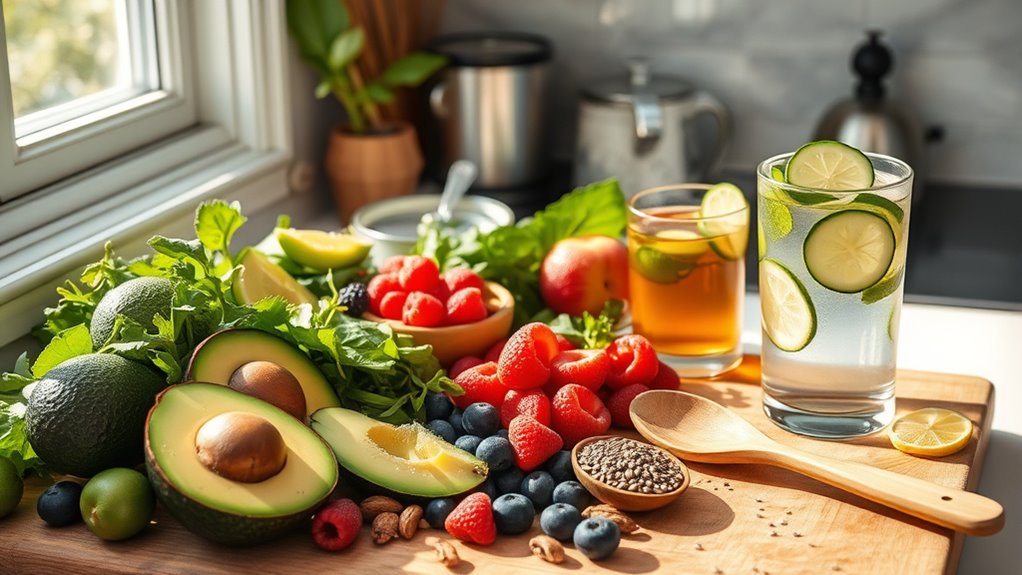 To balance hormones naturally, focus on eating enough protein from sources like eggs, chicken, and fish to support hormone production, and include fiber-rich foods to boost gut health and hormone detoxification. Regular exercise, stress management, and getting enough sleep also help stabilize hormone levels. Limiting refined carbs, sugar, and alcohol prevents insulin resistance. Prioritizing these lifestyle and dietary tips can improve your hormonal health—and there’s more to discover if you keep exploring.