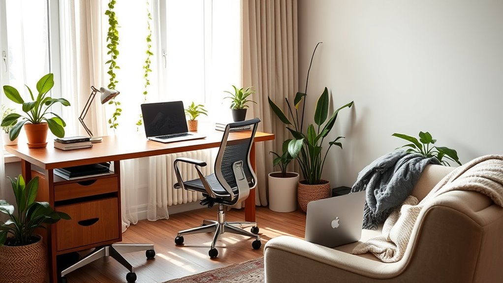By blending your office and oasis, you create a space that boosts productivity and relaxes your mind. Don’t worry about clutter—use smart storage and calming decor to keep things tidy and inviting. Visualize a cozy corner with a sleek desk, lush plants, and soft lighting, making work feel less like a chore and more like a retreat. With a little effort, your hybrid workspace becomes a perfect balance of focus and tranquility.