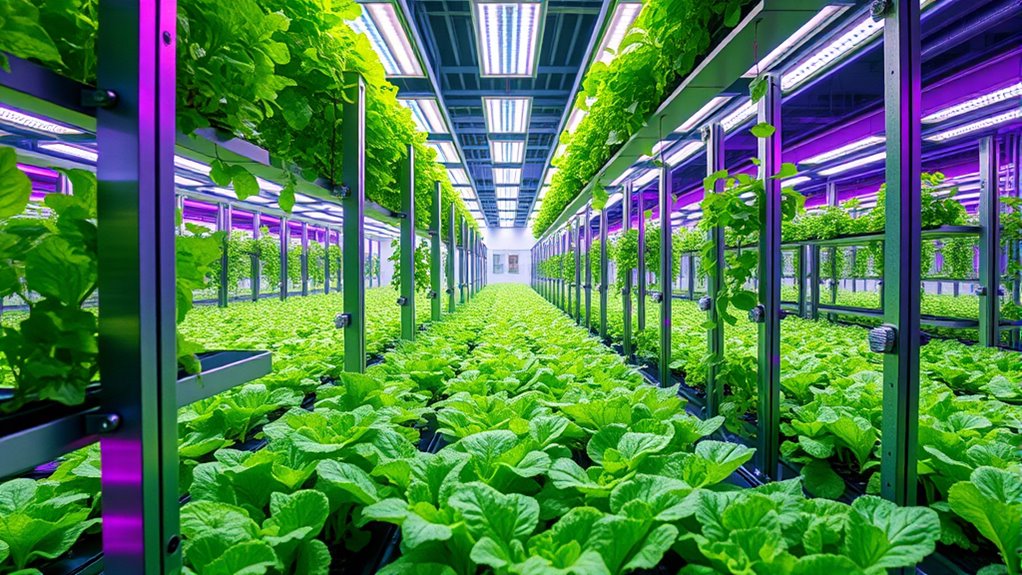 Indoor farming allows you to grow fresh food and greens all year round using advanced technology like hydroponics, aquaponics, and aeroponics. These methods recycle water and nutrients, conserving resources and minimizing land use. Controlled environments optimize light, temperature, and humidity for perfect growth, boosting crop quality while reducing pests and chemical use. By incorporating automation and smart sensors, indoor farming becomes efficient and eco-friendly. Keep exploring to discover how this innovative approach can transform your food sources.