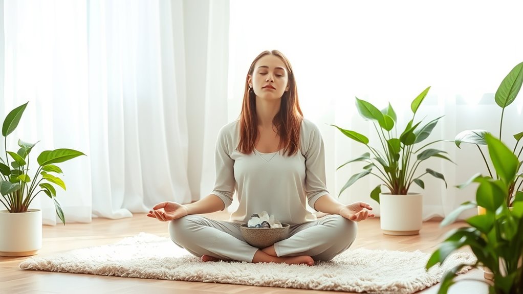 Starting meditation and mindfulness as a beginner involves simple practices like focusing on your breath, sensations, or visualizations for about 10 minutes daily. Find a quiet space, sit comfortably, and notice distractions without judgment, gently redirecting your attention. Techniques such as chakra balancing visuals or deep breathing can boost your energy and calmness. Consistency is key, and over time, you’ll notice improved mental clarity, emotional balance, and overall well-being—keep exploring to discover even more ways to enhance your practice.