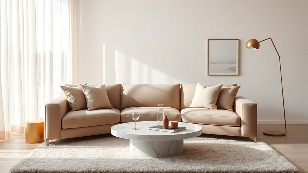 You can balance comfort and sophistication by creating textural contrast with soft rugs, plush throws, and smooth furniture surfaces. Incorporate statement accessories like elegant lamps or art pieces to add visual interest without overwhelming the space. Keep your color palette neutral and layered, using natural materials like wood and linen. Prioritize functional layouts with clever storage, allowing the room to feel both inviting and refined, fostering a harmonious balance.