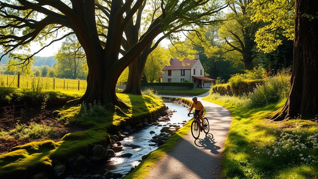 Explore hidden European bike trails that wind through peaceful forests, rolling hills, and winding rivers. Along the way, you can stop at charming villages and savor meals at Michelin-starred restaurants, adding a gourmet touch to your adventure. These lesser-known routes are well-maintained and perfect for all skill levels, offering both scenic beauty and safety. Keep going to discover specific trails and tips to make your journey unforgettable.