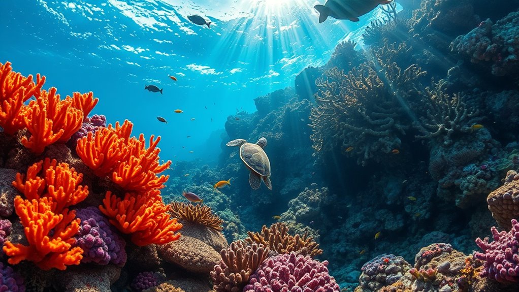 Exploring coral gardens and underwater landscapes reveals vibrant ecosystems teeming with life. You’ll encounter colorful corals, sponges, and sea creatures in habitats stretching from shallow reefs to deep-sea forests. These environments act as essential nurseries and provide shelter for countless species, shaping the ocean’s biodiversity. While they face threats from human activity, understanding their importance helps protect these wonders. Keep exploring to discover the mysteries hidden beneath the waves and how we can preserve them.