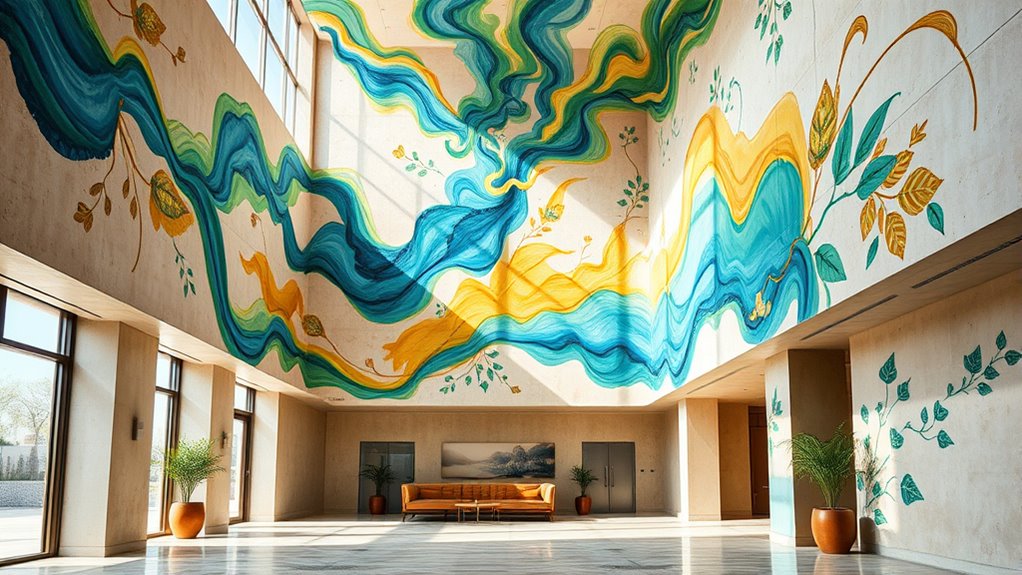 Think of choosing materials for freehand hospitality art like crafting a sturdy bridge; you need durability and versatility. Wood surfaces offer warmth and resilience, while canvases provide a traditional, adaptable base. Acrylic paints dry quickly and hold vibrant colors, perfect for dynamic murals. Using textured plaster or metallic finishes adds tactile luxury. These materials guarantee your artwork remains beautiful and durable, enhancing the guest experience with lasting visual impact.