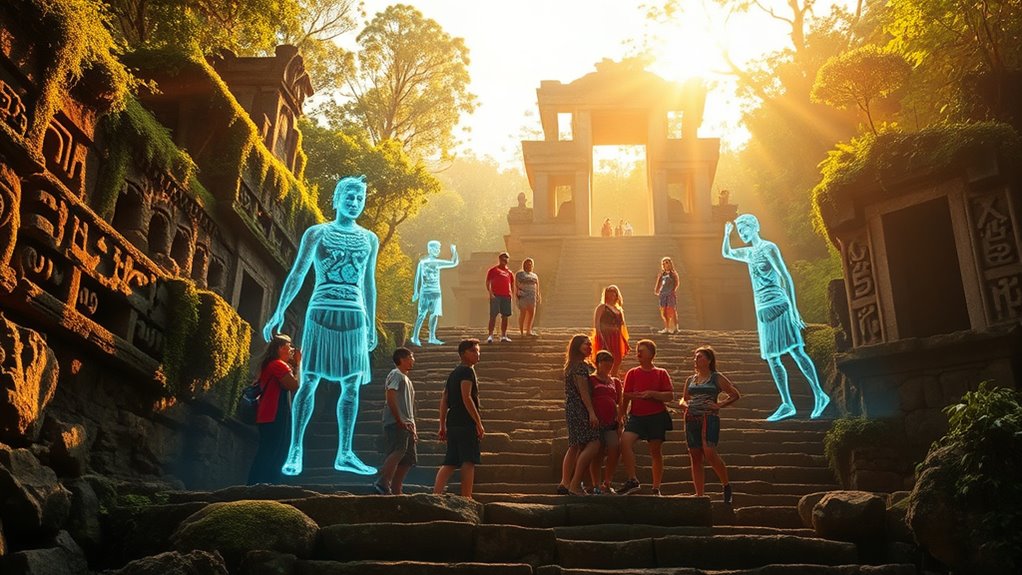 An immersive Mayan ruins tour now uses hologram guides to bring history to life. As you explore, these holograms respond to your questions, offering detailed stories about Mayan sites and symbols. They provide interactive, three-dimensional reconstructions that enhance your understanding and engagement. Instead of static plaques, you’ll experience dynamic visual storytelling that transforms sightseeing into a virtual archaeological adventure. Keep exploring to discover how this innovative approach is changing the way we connect with the ancient past.