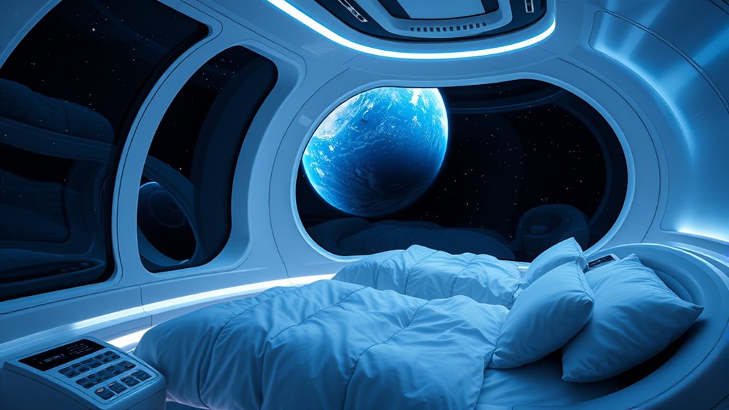 Sleeping in space at the new commercial orbital hotel is a unique experience designed specifically for microgravity. You’ll stay in small, secured compartments with hammock-like beds that prevent drifting. The hotel offers advanced climate controls, soundproofing, and personalized lighting to help you get restful sleep. As technology advances, space tourism is improving sleep comfort, making it almost like resting on Earth. Keep exploring, and you’ll discover how these innovations create a truly seamless, restorative sleep experience in orbit.