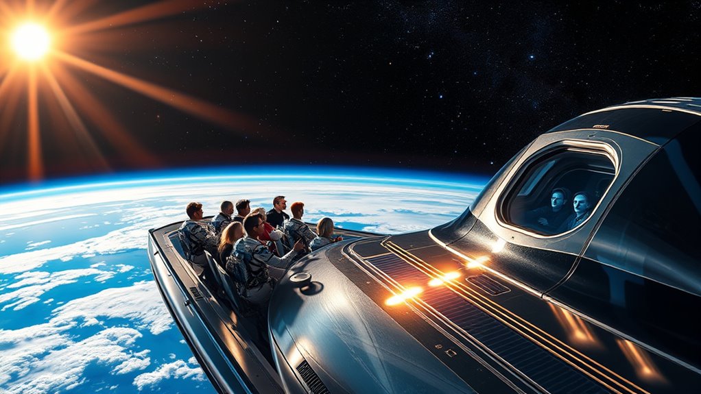 Future technological advancements, like spacecraft innovations and virtual reality, will make space tourism more accessible. You’ll experience fully autonomous, reusable spacecraft that lower costs and improve safety. Virtual reality can prepare you for the trip by simulating space environments, reducing anxiety and boosting confidence. These innovations will streamline the journey, expand destinations, and offer immersive pre-flight experiences, making space travel easier and more inviting for everyone, not just the wealthy.