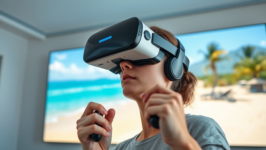 You need a VR headset and motion controllers for immersive virtual travel. The headset provides stereoscopic 3D visuals and spatial audio, creating a realistic experience. Motion controllers let you interact with virtual environments, enhancing immersion. Pack your headset carefully, along with controllers, extra batteries, and headphones, to guarantee smooth exploration. This setup allows you to navigate and enjoy virtual destinations as if you were truly there, making your travel previews more engaging.