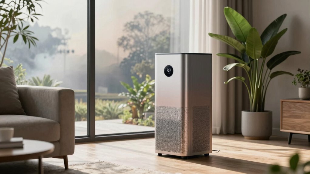 Effective VOC and odor control in air purifiers hinges on the quality of the activated carbon filters they use, as these filters are vital for adsorbing and neutralizing volatile organic compounds and smoky smells from wildfire smoke. A high-quality activated carbon filter with a large surface area considerably boosts the purifier’s ability to reduce chemical emissions and strong odors. Combining activated carbon with HEPA filters in a multi-stage system further improves overall removal of VOCs and smoke-related odors. Air purifiers with increased airflow and higher CADR ratings for smoke are more efficient at capturing and eliminating VOCs and odors during wildfire events. Remember, regularly replacing activated carbon filters is essential to maintain ideal VOC and odor removal performance over time.
