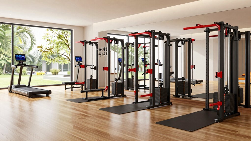 These gyms include essential safety features like adjustable safety stops, non-slip grips, and sturdy frame construction to prevent accidents. I appreciate that many models also have clear instructions and safety locks on weights, ensuring a secure workout. I always check for these features before using a new gym, as they help me feel confident and protected during my exercises. Safety is a top priority with these versatile home gyms.