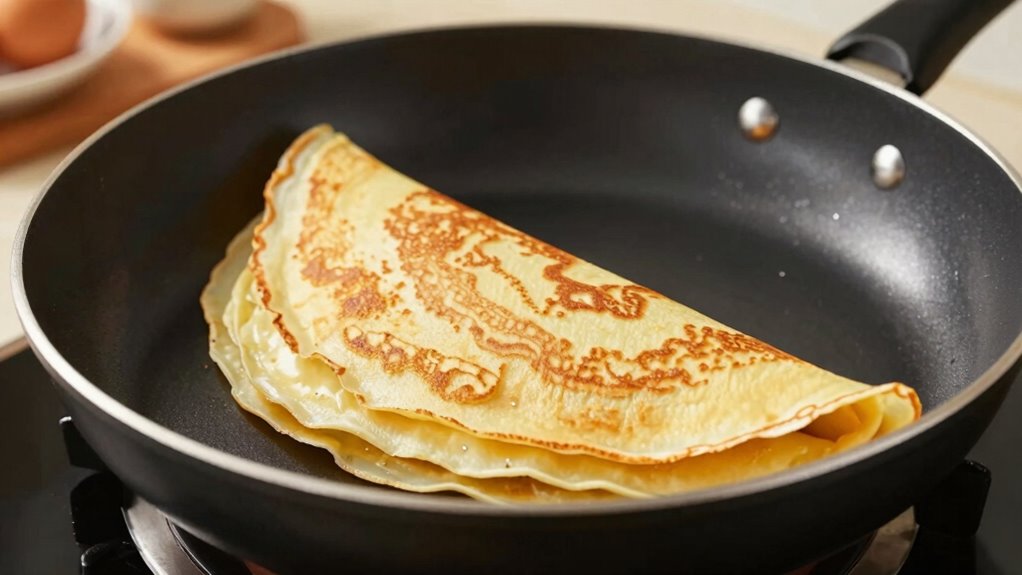 For making large crepes, I recommend a pan about 12 to 14 inches in diameter. This size gives you enough surface area to spread the batter thinly and create those big, restaurant-style crepes. I find that a wider pan also makes flipping easier without worrying about spilling. Just guarantee the pan heats evenly, so your crepes cook perfectly without sticking or burning.