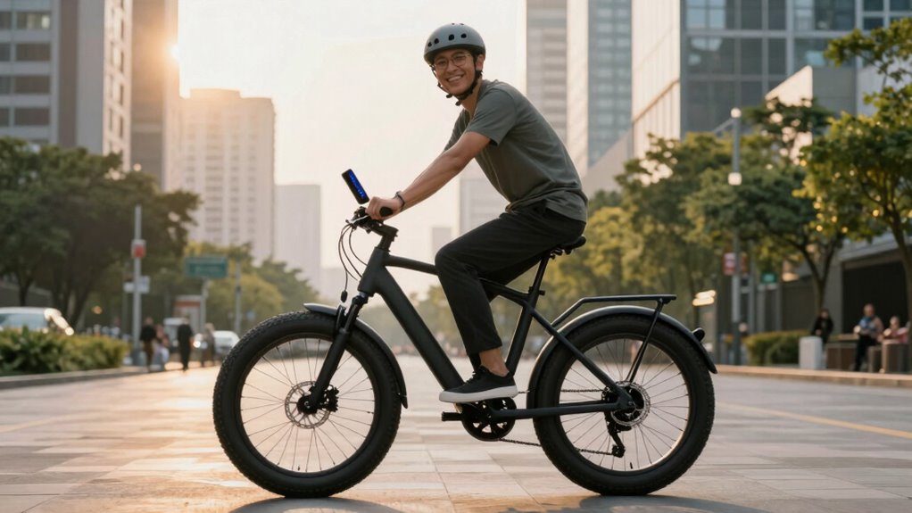 Since proper handlebar height is vital for maintaining a comfortable and ergonomic riding posture, tall riders should prioritize bikes that offer multiple adjustment options. Many electric bikes feature adjustable handlebars with quick-release clamps or telescoping stems, making it easy to customize the fit. Proper handlebar height should align with your saddle height to guarantee maximum control and reduce strain. Bikes with higher handlebar positions help lessen wrist and shoulder fatigue, especially during longer rides. Choosing an e-bike with a range of handlebar height settings allows you to fine-tune your position for maximum comfort and safety. This flexibility not only improves your riding experience but also helps prevent discomfort and potential injury over time, making it an essential factor for tall riders seeking a personalized fit.