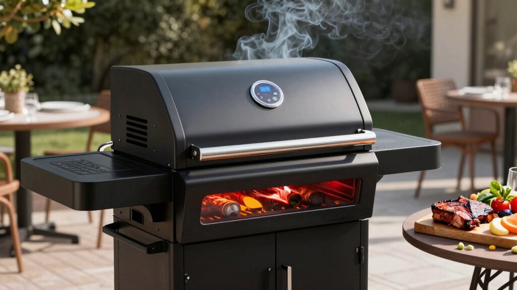 When selecting an electric smoker grill, paying attention to durability and materials is essential to guarantee it withstands outdoor conditions and frequent use. High-quality materials like stainless steel, powder-coated steel, or heavy-duty aluminum are common in durable models, resisting rust, corrosion, and UV damage. These materials help the grill last longer, even with exposure to the elements. Insulated chambers made from thick, layered materials improve heat retention and energy efficiency. Removable components such as water trays, racks, and grease trays made of corrosion-resistant metals make cleaning easier and boost longevity. Additionally, a solid build with sealed joints and sturdy handles enhances overall durability, ensuring your smoker performs well over time despite regular use and adverse weather.