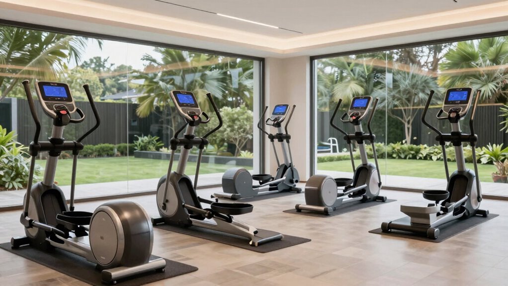 Multiple resistance levels give you the flexibility to tailor your workout intensity, whether you’re a beginner or an experienced athlete. Typically, ellipticals offer between 8 to 16 resistance levels, allowing you to gradually increase difficulty as your strength improves. Higher resistance settings challenge your muscles more and help build endurance faster. Magnetic resistance systems stand out because they provide smoother, quieter adjustments compared to manual or friction-based options. This makes changing resistance seamless during your workout. Digital controls or knobs make it easy to switch between levels without interrupting your session. Having multiple resistance options not only enhances the versatility of your workout but also enables various training programs, from warm-ups to high-intensity intervals. This feature is essential for customizing your fitness journey comfortably at home.