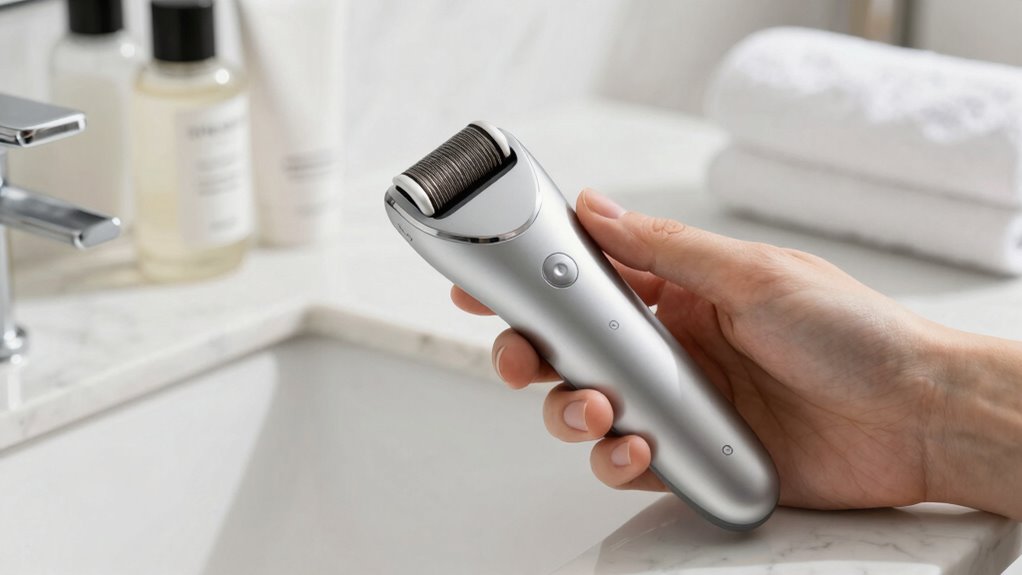 Long-lasting battery life is essential for a seamless epilation experience, especially if I want to avoid interruptions during longer sessions. A battery capacity of at least 300mAh typically supports 30 to 60 minutes of cordless use, perfect for full-body treatments. Fast-charging features are a game-changer, allowing me to quickly recharge and reduce downtime. Some epilators even include indicator lights that show remaining battery life, so I can plan my sessions better. Rechargeable batteries are a smart choice—they’re eco-friendly and save me money on disposable batteries. Overall, a long-lasting, quick-charging battery makes epilation more convenient and reliable, whether I’m at home or traveling. It guarantees I can complete my routine without stress or interruption.