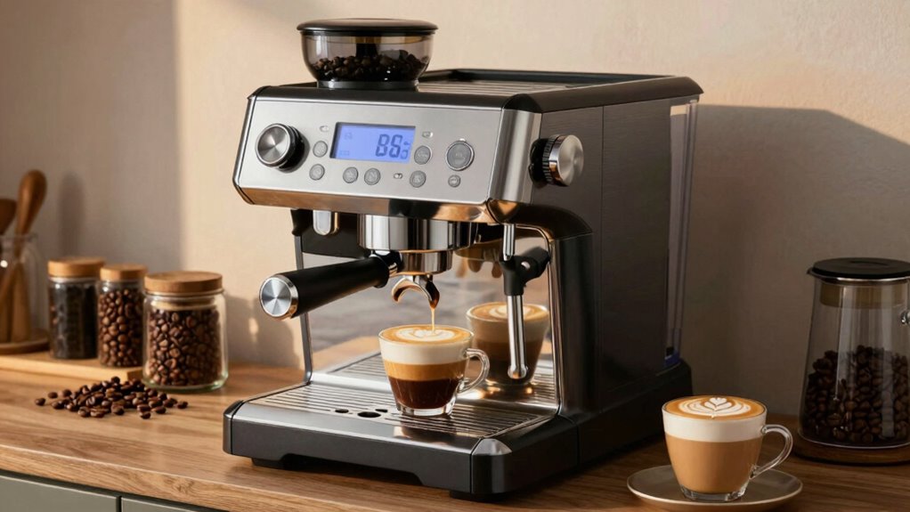 If you’re searching for the 15 best espresso machines for lattes and cappuccinos in 2026, I’ve got you covered. These models feature powerful steam wands, automatic milk frothers, and consistent pressure systems to make barista-quality drinks at home or in your café. They’re compact, user-friendly, and built with durable materials for long-lasting performance. Want to discover which machine best fits your needs? Keep going, and you’ll find all the details you need to choose the perfect espresso maker.