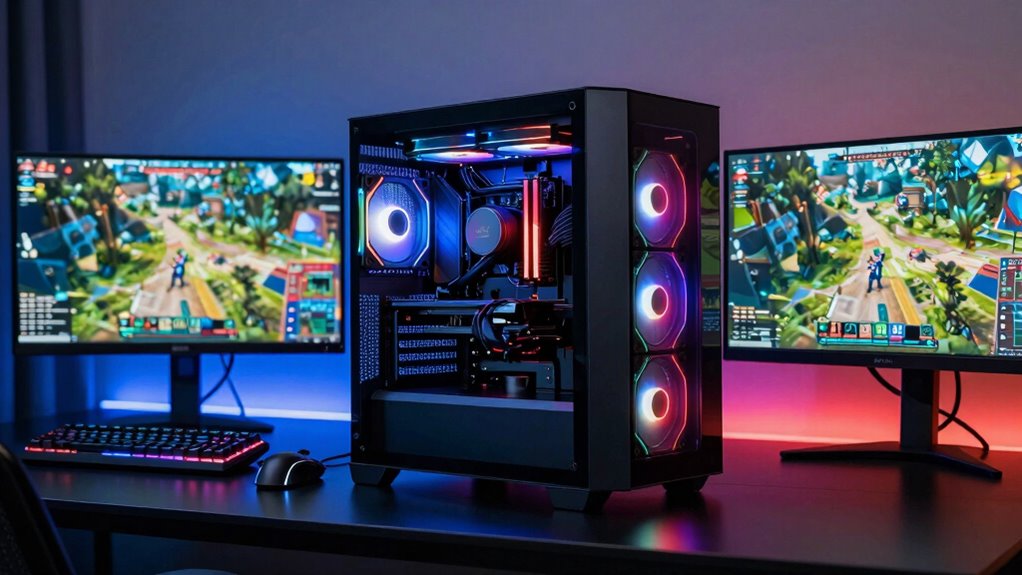 Selecting the right memory and storage options is essential for peak gaming performance and smooth system operation. I recommend at least 16GB of RAM for most gamers, as it handles modern games well, while 32GB or more is better if you stream or multitask heavily. When choosing RAM, consider DDR4 or DDR5; DDR5 offers higher speeds and better performance but tends to cost more. Storage-wise, a 1TB NVMe SSD strikes a good balance, providing fast load times and enough space for games and applications. Remember, your total storage should match your library, media, and software needs, leaving room for future updates. Upgrading later is possible but can be limited by motherboard compatibility, so pick your memory and storage wisely from the start.