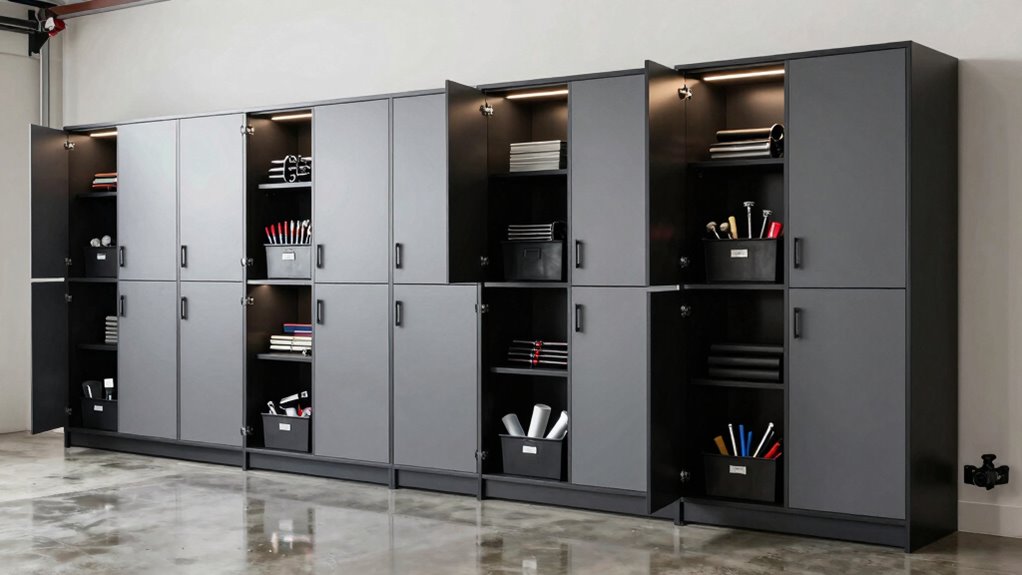 Choosing a garage storage cabinet set that offers versatility and flexibility can make a big difference in how I organize my space. Adjustable shelves let me customize storage for items of all sizes, while modular components and reconfigurable layouts adapt to different garage setups. Cabinets with built-in pegboards and hooks give me extra options for hanging tools and accessories, making everything more accessible. Lockable doors and secure compartments are essential for protecting valuables or hazardous items without sacrificing convenience. I also look for durable materials like heavy-gauge steel and reinforced structures, which support a wide range of stored items and ensure longevity. Overall, a versatile, flexible cabinet system helps me maximize space and adapt as my storage needs evolve.