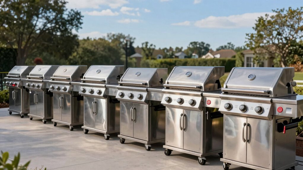 A stainless steel gas grill’s portability and storage features can considerably enhance your outdoor cooking experience. Portable models often have foldable legs, locking lids, or carrying handles, making them easy to move and store. Compact designs with integrated handles and lightweight materials are perfect for tailgating, camping, or outdoor events. Many grills include locking lids or fold-away side tables to secure the unit and reduce its footprint during transport. Sturdy wheels, especially lockable casters, allow smooth movement across different terrains while keeping the grill stable when stationary. Additionally, built-in storage options like cabinets, side shelves, and tool hooks help keep your grilling accessories organized and within reach. These features make outdoor cooking more convenient and enjoyable.