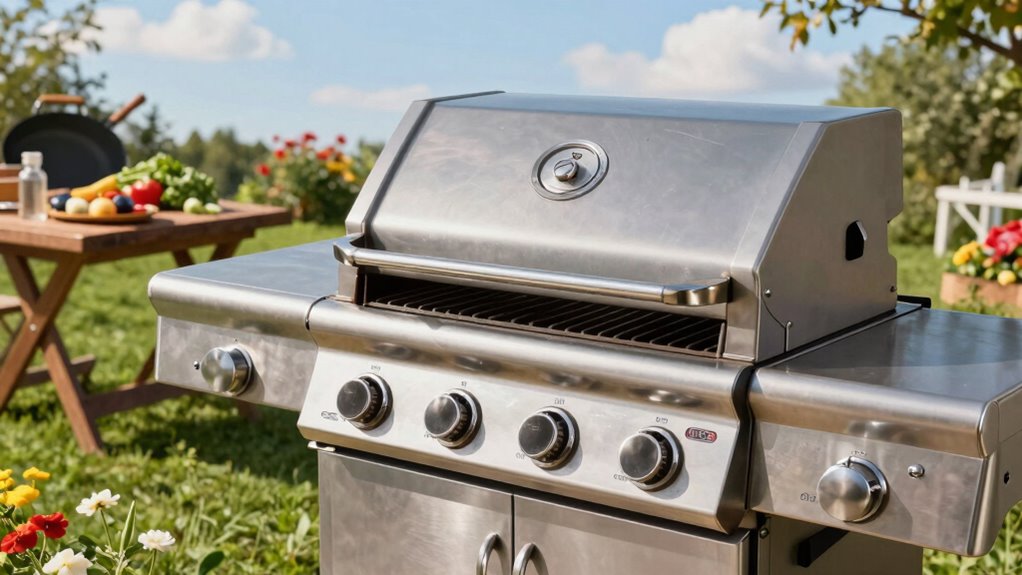 Choosing the right gas grill depends heavily on its burners and BTUs, as these factors determine how much heat it can produce and how versatile your cooking options will be. The number of burners affects your capacity to cook different foods simultaneously and enables zone cooking with direct and indirect heat areas. Typically, a grill with 3-4 burners and 30,000 to 50,000 BTUs is sufficient for most backyard needs. However, higher BTUs don’t always mean better performance; heat distribution and grill design matter just as much. More burners can increase cooking space and flexibility, but it’s important to guarantee even heat distribution. Balancing burner count and BTU output helps you achieve ideal grilling results tailored to your cooking style.