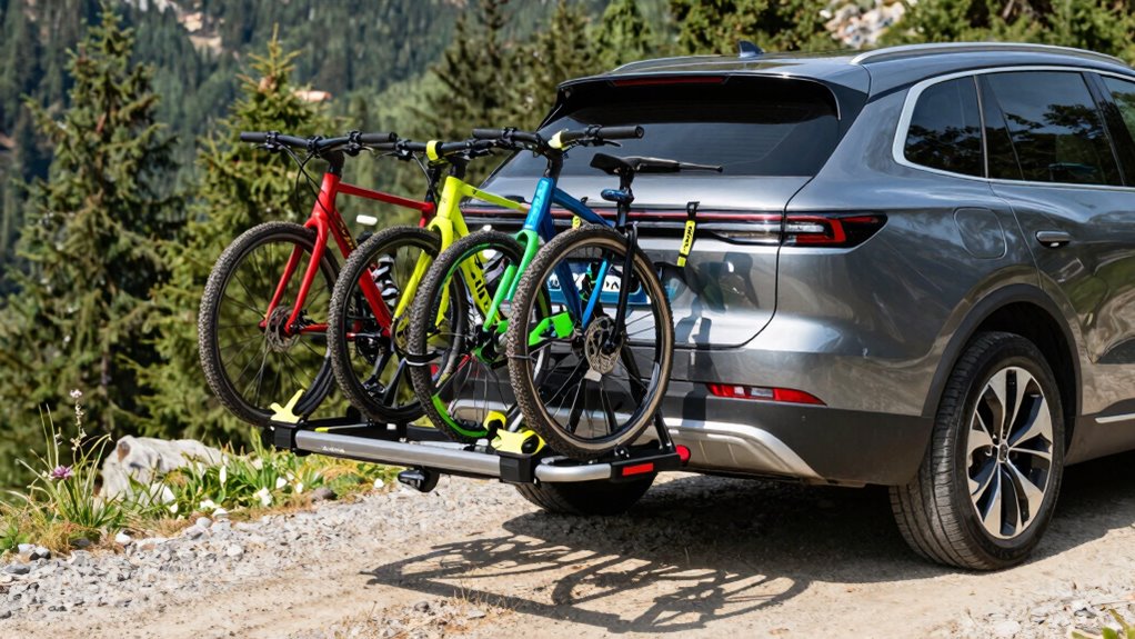 When it comes to keeping your bikes safe during transport, security features should be a top priority. I look for hitch bike racks with anti-theft locking pins that secure bikes to the rack and deter theft. Built-in security features like integrated cable locks or lockable support arms add extra protection, giving me peace of mind. Reliable locking mechanisms are essential to secure the entire rack to the vehicle hitch, reducing the risk of theft or accidental detachment. I also prefer padded clamps or straps that prevent frame damage while holding bikes securely. Additionally, racks with lockable hitch pins and extensive locking systems for both bikes and the rack itself provide an added layer of security. These features are vital to guarantee your bikes stay safe during transit.