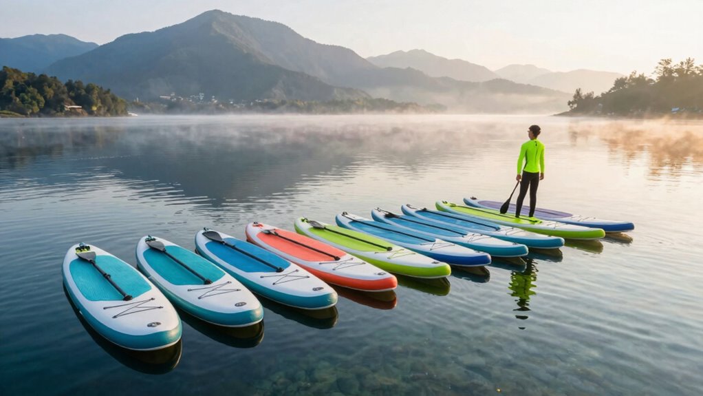 Inflatable paddle boards that are quick and easy to set up can make your touring adventures more enjoyable from the start. Look for boards that inflate in under 10 minutes to save time and effort. A double-action pump is a great feature, as it halves inflation time compared to single-action models. Make certain the board supports a high maximum pressure, around 15-20 PSI, which makes inflation easier and more efficient. Additionally, a lightweight design and manageable size when deflated help with quick setup and transport. An easy-to-use valve system is also essential, allowing for secure and fast inflation and deflation. Prioritizing these features ensures you’ll spend less time preparing and more time enjoying your paddleboarding adventures.