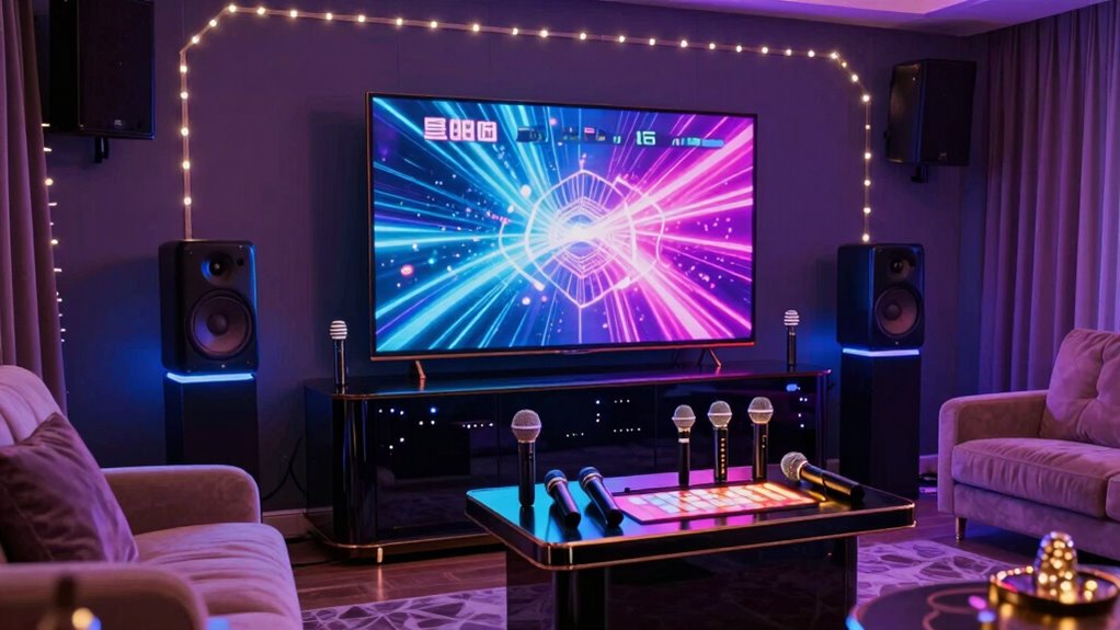 Light effects and visuals can transform a karaoke session from ordinary to unforgettable. Dynamic LED light shows that sync with music add energy and make performances more engaging. Multiple lighting modes, like color-changing, strobe, or fade effects, let you customize the atmosphere to match any party theme. Visual effects such as RGB lighting and disco lights create a lively ambiance, elevating the entertainment experience. Adjustable light brightness and effect speed give you control over the visual impact, ensuring it suits your mood and setting. Vibrant, sound-reactive displays can energize the crowd and encourage audience participation. When choosing a karaoke machine, look for versatile lighting options that enhance your performance and set the perfect mood for any gathering.