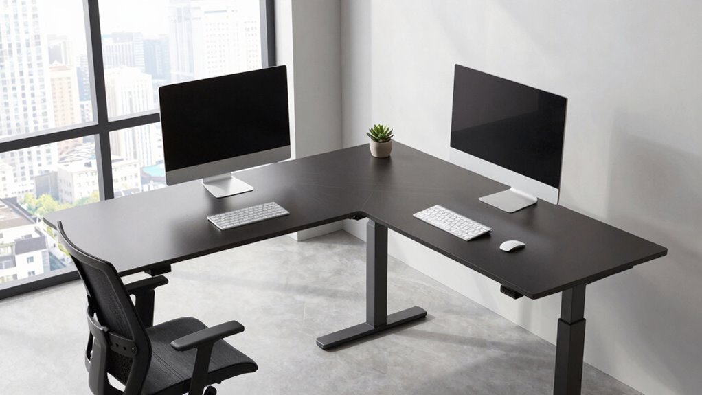 Choosing an L-shaped standing desk with the right adjustable height range is essential for guaranteeing comfort and flexibility throughout your workday. A wider range, like from 27 to 47 inches, makes it easy to switch between sitting and standing positions without hassle. It’s important to check that the maximum and minimum heights suit your ergonomic needs to maintain good posture and reduce strain. The type of height adjustment mechanism also matters—electric lifts tend to be smoother and more precise, while manual options may require more effort but still offer reliable control. Selecting a desk with a stable, accurate height range ensures you can set your workspace exactly how you need it, promoting healthy work habits and comfort during long hours.