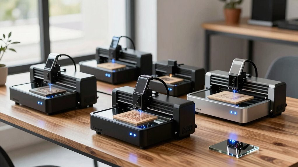 If you’re looking for the best laser engravers for home use in 2026, I’ve got some great options for you. From compact models like the WIZMAKER 2.5W and LaserPecker LP1 Pro to more versatile machines like the Creality 10W and ACMER engraver, there’s something for every project and budget. Safety features, software compatibility, and size are key factors I consider. Keep exploring, and you’ll find the perfect fit for your creative needs.