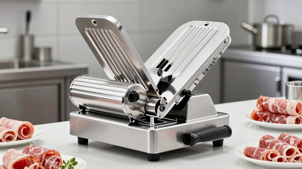 Choosing the right commercial meat slicer is like finding the Holy Grail of the kitchen—powerful, reliable, and easy to use. With options from 10 to 12 inches and adjustable thickness, you’ll be slicing like a seasoned chef in no time. Remember, even in this digital age, a sturdy slicer can be your best ally, much like a trusty knight’s sword. So, pick wisely and elevate your meat game to legendary status!
