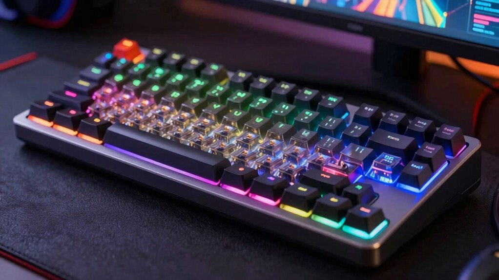 Choosing the right mechanical keyboard depends heavily on the switch types, as they determine the overall feel and sound of your typing experience. Linear switches offer smooth keystrokes with little resistance, making them perfect for gaming where quick, effortless presses matter. Tactile switches provide a noticeable bump without loud noise, giving satisfying feedback without disturbing others. Clicky switches produce an audible click and a tactile bump, ideal for typists who want clear confirmation of key activation. Switch feel is also influenced by actuation force; lighter switches need less effort, while heavier ones offer more resistance, affecting comfort and speed. Durability is key too—most switches last between 50 and 100 million keystrokes, ensuring long-lasting performance for intense gaming or typing sessions.