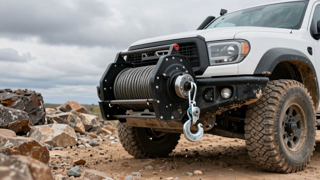 Choosing the right off-road winch for your truck starts with understanding its capacity needs; if the winch can’t manage the weight you’re recovering, it can lead to equipment failure or unsafe situations. You should determine the maximum weight of your vehicle plus any additional loads to verify the winch’s capacity exceeds this total. A good rule of thumb is to select a winch with at least 1.5 times your vehicle’s weight for effective recovery. For larger trucks or heavy-duty use, opt for winches rated at 13,000 lbs or more to handle extreme situations. Matching the winch’s load capacity to your off-road conditions prevents damage and ensures safety. Overestimating capacity provides a margin of safety, helping you tackle unexpected heavy loads or complex recoveries confidently.