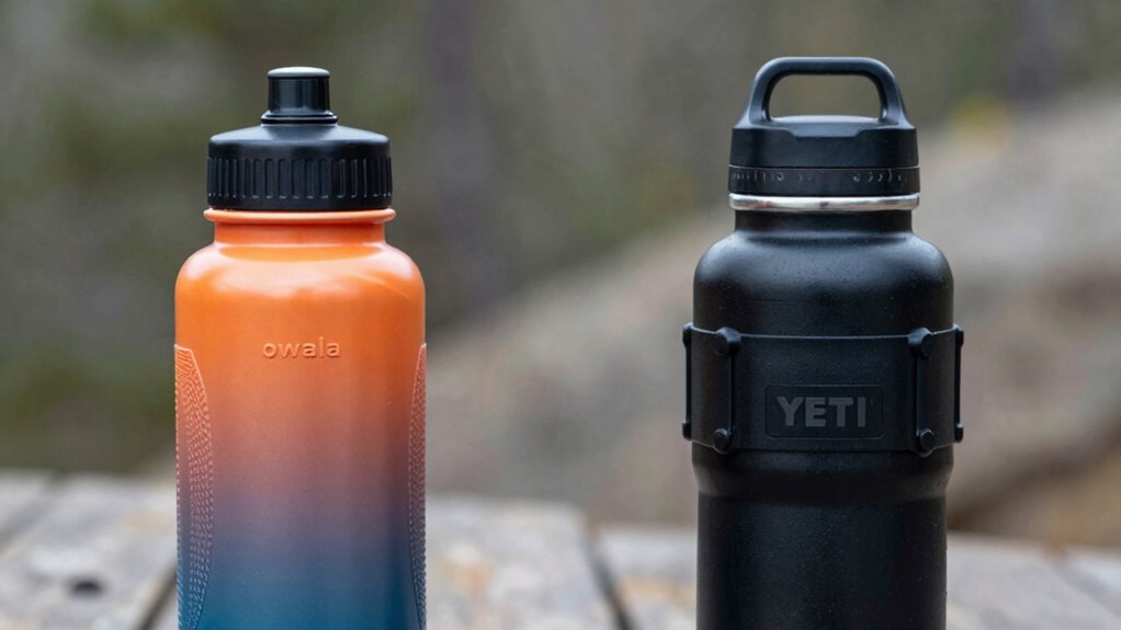When selecting between Owala and Yeti water bottles, the drinking options they offer play a crucial role in meeting your hydration needs. Owala bottles feature a patented FreeSip spout that provides two modes: upright sipping through a built-in straw or tilting to sip from the spout opening. This versatility makes it perfect for different situations, whether you’re working at your desk or on the go. On the other hand, Yeti bottles typically come with a Chug Cap or straw cap that allows quick, spill-proof sipping, ideal during intense activities or outdoor adventures. Both brands prioritize leak-proof designs, but Owala’s dual-mode spouts give you more flexibility to switch between sipping styles based on your preference or activity.