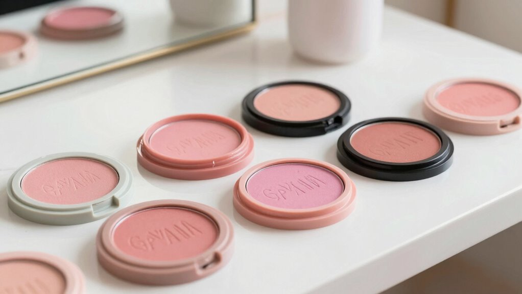 The texture and finish of a blush substantially influence how it looks and feels on your skin, making them crucial factors to consider when selecting a dupe. Different textures—cream, liquid, matte, dewy, or multi-use sticks—offer distinct application experiences and finishes. The finish, whether matte, dewy, or natural, shapes your overall look, with some formulas giving a luminous glow while others create a velvety matte effect. The product’s consistency, like lightweight or dense, impacts ease of blending and how well it integrates with your makeup. Some textures are designed for buildable coverage, letting you layer for a subtle or bold look. Choosing the right texture and finish depends on your personal style, skin type, and preferred makeup vibe.