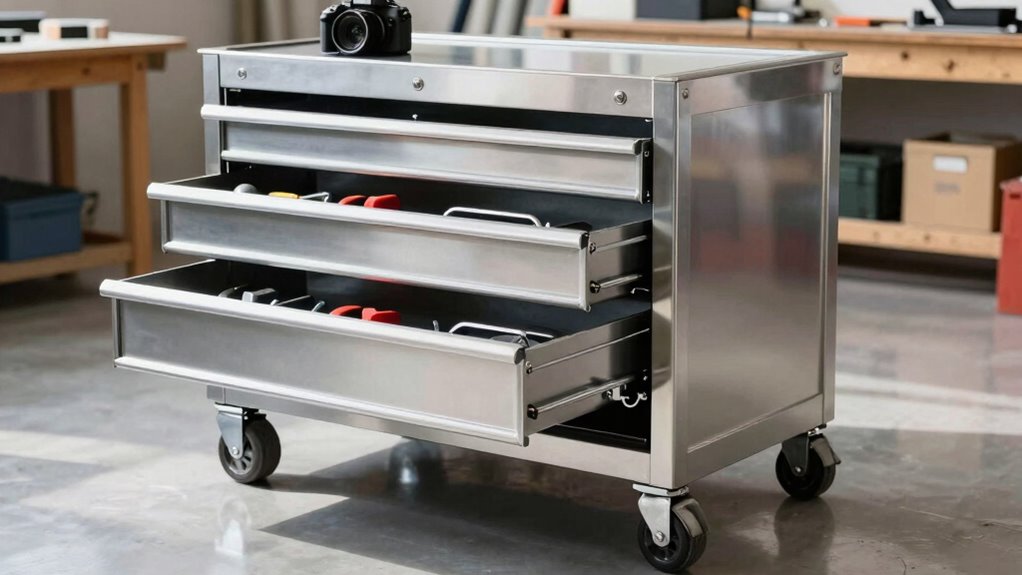 I recommend stainless steel or aluminum for rust-resistant rolling tool chests. Stainless steel is durable and highly resistant to corrosion, making it ideal for humid environments. Aluminum is lightweight and also resists rust well. Some chests feature powder-coated finishes that add extra protection against moisture and rust. When choosing, look for these materials to guarantee your tool chest stays in great shape for years to come.
