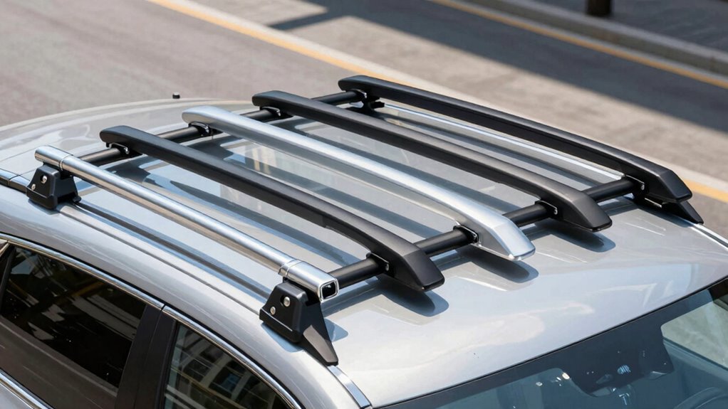 When choosing roof rack cross bars, paying attention to their aerodynamic design can make a noticeable difference in your driving experience. An aerodynamic shape reduces wind resistance, which in turn lowers drag and boosts fuel efficiency. Streamlined cross bars generate less wind noise, making your drives quieter. A low-profile, sleek design helps prevent lift and turbulence, keeping your vehicle stable at higher speeds. Properly designed aerodynamic crossbars ensure even airflow over the roof, decreasing rattling and vibrations. Plus, advanced aerodynamic features can improve overall vehicle handling by minimizing drag. When shopping, look for cross bars with smooth contours and minimal protrusions, as these features contribute to better performance, quieter rides, and increased efficiency during your travels.