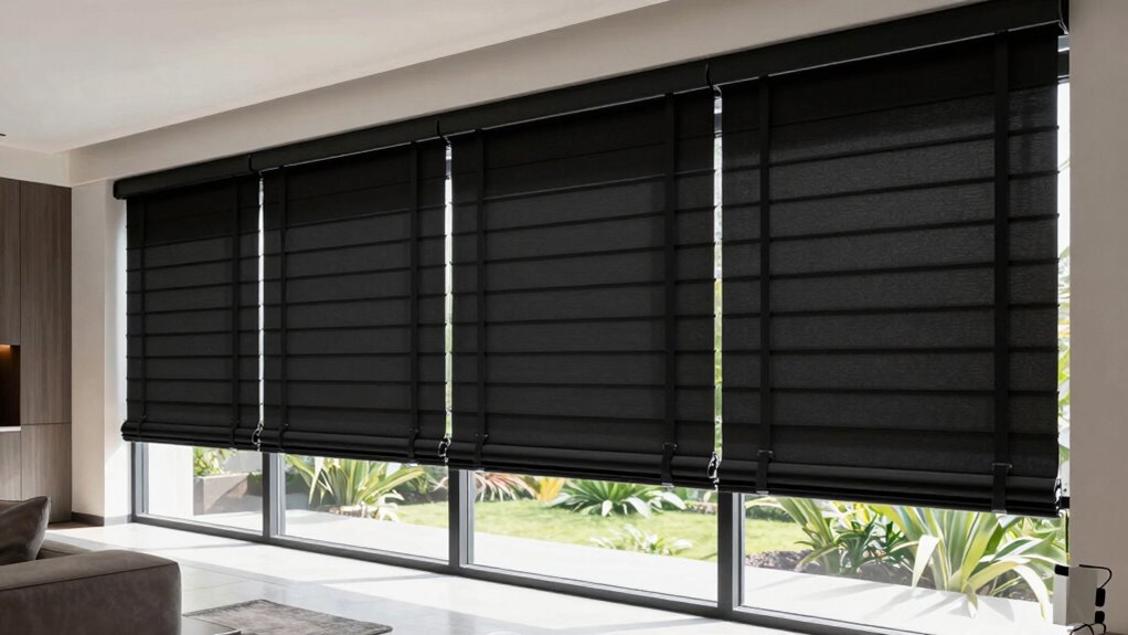 The installation process for motorized blackout blinds is pretty straightforward. I start by measuring my window to guarantee a perfect fit, then I mount the brackets using a drill and screws. Next, I attach the blinds to the brackets and connect the motorized system, either via Wi-Fi or a dedicated remote. Finally, I sync the blinds with my smart home system, and I’m all set to control them remotely.