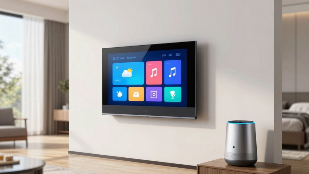 Security on smart home hub displays is solid and sophisticated. They often feature strong encryption, secure login options, and regular firmware updates to fend off threats. Many also include voice recognition or face ID, adding an extra layer of safety. I feel confident knowing these features protect my privacy while I manage my smart home seamlessly. It’s reassuring to see such robust security, ensuring my connected world stays safe and sound.