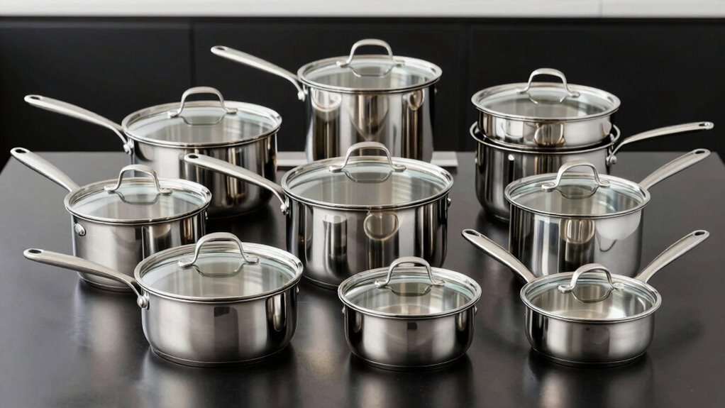 Choosing a stainless steel cookware set starts with understanding the importance of material quality and safety. I look for sets made from 18/8 or 18/10 stainless steel, which contain 18% chromium and 8-10% nickel, ensuring durability and resistance to corrosion. Non-toxic, food-grade stainless steel is essential, as it prevents harmful chemicals from leaching into my food, unlike lower-grade or coated options. I also check that the cookware is free from PFOA, PTFE, PFAS, lead, and cadmium, especially for high-temperature cooking. Multi-layer or tri-ply construction with an aluminum or copper core helps distribute heat evenly, reducing hotspots and burning risks. In conclusion, dishwasher-safe cookware simplifies cleaning and maintains hygiene, making it a safer choice for ongoing use.