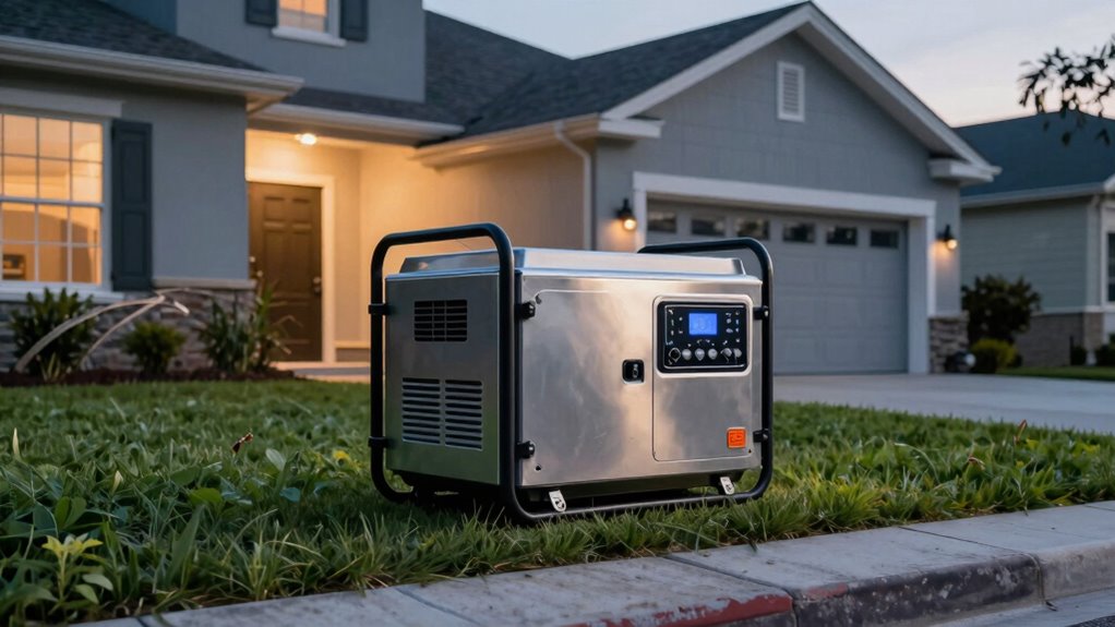 Ensuring safety features are integrated into a whole house generator with auto start is essential for protecting your home and loved ones. Many models include automatic low oil shutdowns to prevent engine damage when oil levels get too low, ensuring longevity and reliability. Integrated circuit protection guards against electrical overloads, safeguarding both the generator and connected appliances. Some units are equipped with carbon monoxide sensors that automatically shut down the generator if dangerous CO levels are detected, preventing poisoning risks. Transfer switch compatibility is crucial to avoid back-feeding electricity into the grid when power is restored, enhancing safety for utility workers and your home. Additionally, GFCI outlets and circuit breakers protect users from electrical faults, making sure your backup power solution operates safely and effectively at all times.