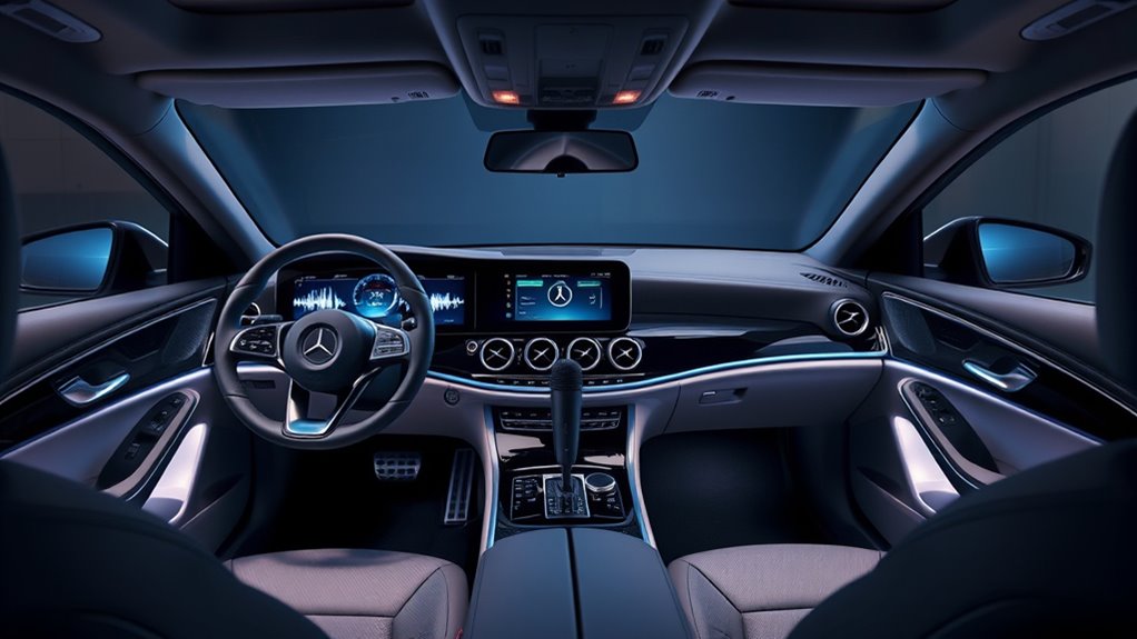 You might think onboard music tools could distract you, but Mercedes-Benz integrates safety features like voice commands, so you can control music hands-free. Touchscreen controls are designed to be intuitive and minimize distraction, while alerts prevent accidental adjustments. Additionally, the system monitors your driving patterns, adjusting volume or pausing music if it detects unsafe driving behaviors. These features help you stay focused and safe while enjoying your favorite tunes.