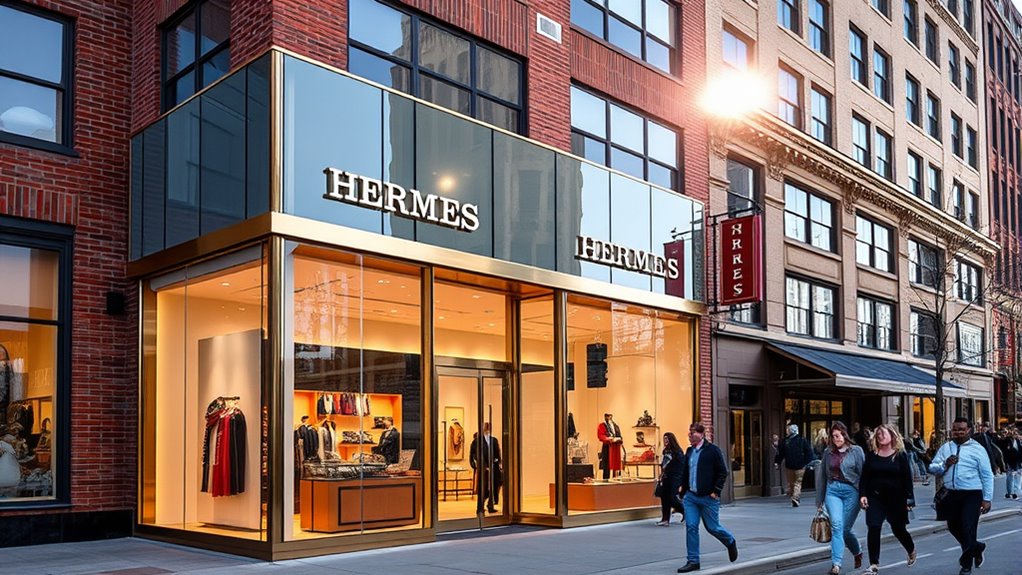 Hermès chooses new retail locations carefully, focusing on markets with high luxury demand and strong economic growth. You’ll find they analyze foot traffic, local demographics, and brand fit to guarantee their stores align with the surrounding environment. They also consider exclusivity and the prestige of the neighborhood. By doing so, Hermès ensures each store enhances their brand image, attracts the right clientele, and offers a seamless shopping experience.